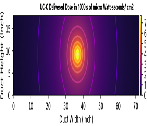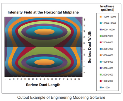 Once the kill rate and subsequent desired delivery Dose (light fluence) is finalized and exposure time is field-determined, EMA sets out to design a lamp array system to deliver the necessary UVGI Intensities (light fluence) in the allotted exposure time. EMA then develops custom Inactivation (Kill) Rates to your building’s air-handlers systems, similar to Table-1, above for SARS-Corona, Tuberculosis and Influence A.