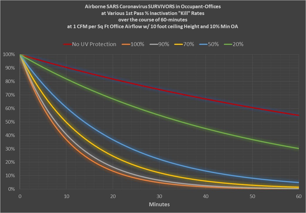 These studies suggest that achieving 99.9% (3 log) 1 st Pass inactivation (kill rate) in airstreams for SARS-corona with UVC at 253.7 nm (2537 Å) is possible when the engineering is carefully performed using dosage modeling software and/or dosing charts.