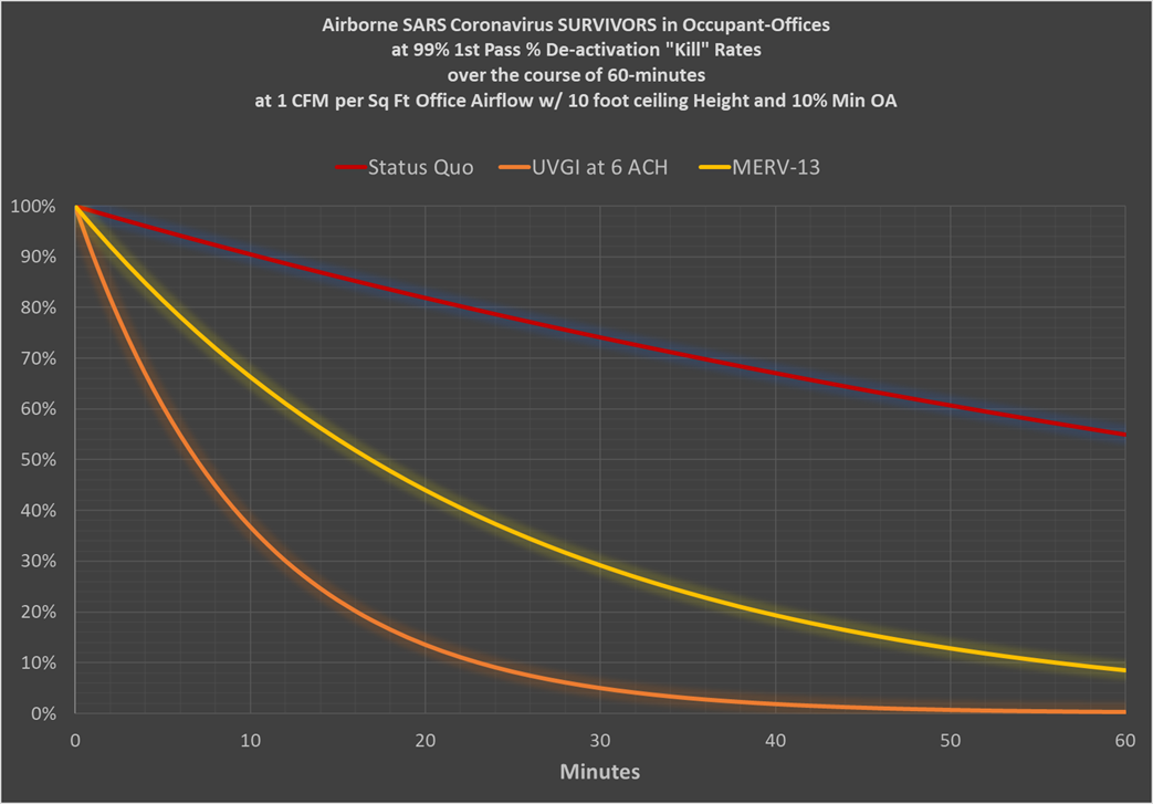 UVGI lamp systems should be the first line of defense against SARS-corona. If you have limited funds and must choose between (A) increasing MERV air-filter ratings or (B) retrofitting with UVGI lamps systems for a 99% (D99 fluence) 1st Pass deactivation (Kill) rate, you should install UVGI. If you have funds to complete both projects then do so because a higher MERV rating will maintain cleaner UVGI lamps, further reducing (slightly) the number of Survivors.