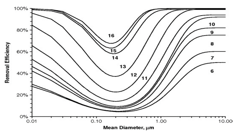 Notice the blue and yellow curves are almost indistinguishable, demonstrating that increasing existing MERV filter ratings cannot outperform UVGI.