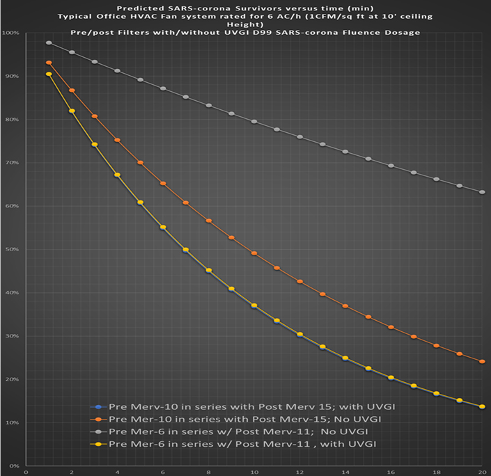 Below is our analysis that demonstrates that whether you have low MERV pre/post filters or higher 10/15 (pre/post) MERVs, matters not, as long as you retrofit with UVGI lamp system designed for 99% 1 st pass deactivation. This chart assumes we are retrofitting a standard RA office air-handler, delivering 1 CFM / sq ft airflows with ceiling height of 10’ (max. 6 “effective” air-changes per hour, based on total air).