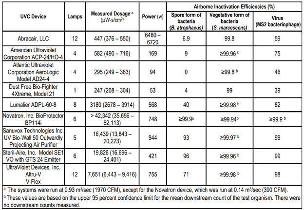 EPA / Homeland Security funded nine (9) studies that documented HVAC In-Duct 1 st Pass Inactivation rates, using UVGI (UVC) at 253.7 nm (2537 Å), as high as 99.98% (almost a 4-log kill) for organisms (spores/bacteria) that are much more difficult to inactivate than SARS-corona.